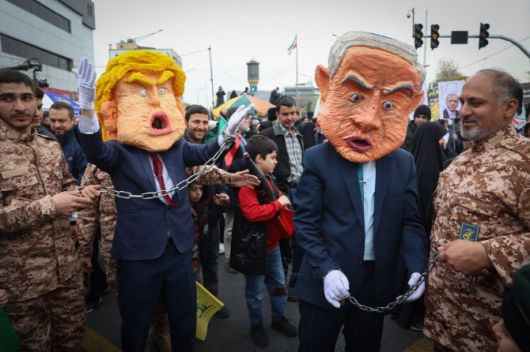 지난 3월 이란 테헤란에서 열린 집회에서 참여자들이 도널드 트럼프 미국 대통령과 베냐민 네타냐후 이스라엘 총리를 연상시키는 모형을 들고 있다.(사진=AFP) |