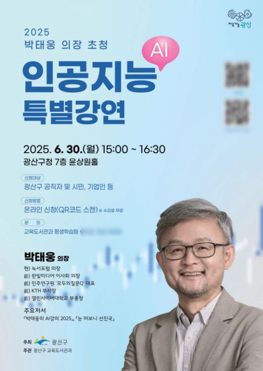 광주 광산구는 오는 30일 오후 3시 구청 7층 윤상원홀에서 박태웅 녹서포럼 의장을 초청해 '인공지능(AI) 특별강연'을 개최한다고 25일 밝혔다.
