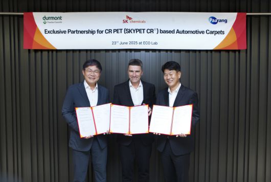 삼사는 전략적인 개발 협력을 통해 SK케미칼의 차별화된 CR PET 소재 Solution을 활용해 차량 매트에 최적화된 원사 제조와 완제품 매트까지 성공적으로 양산 개발을 완료한 바 있다. 제품의 공급과 본격적 시장 확대를 위해 이번 독점 파트너십 협약을 체결하게 됐다.