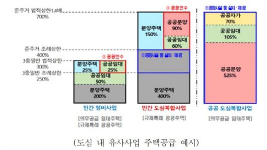 국토부의 ‘도심복합개발법 조례 제정 가이드라인’에 의하면 특례가 적용되는 일부 지역에서는 제2종과 제3종 일반주거지역의 용적률이 700%까지 상향 조정이 가능해진다.