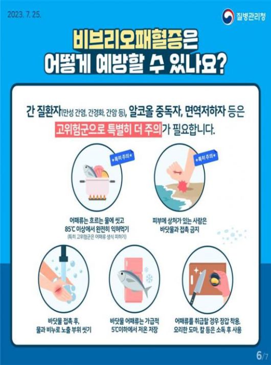 도는 비브리오패혈증을 예방하기 위해 도민들에게 ▲어패류는 반드시 익혀 먹을 것 ▲상처가 있는 경우 바닷물 접촉을 피할 것 ▲어패류를 다룰 때 장갑을 착용할 것 ▲어패류는 5도 이하 저온에서 보관하고 흐르는 수돗물로 세척할 것 ▲사용한 칼과 도마는 반드시 소독할 것 등의 예방수칙 준수를 강조했다.