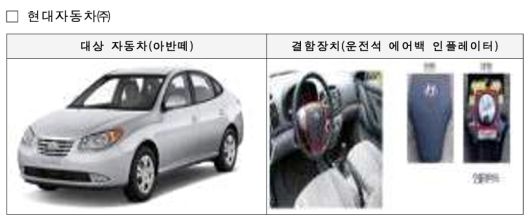 현대 아반떼 등 2개 차종 2555대는 운전석 에어백 전개 시 과도한 내부 압력 증가로 인한 인플레이터의 파손으로 승객이 상해를 입을 가능성이 있어 지난 10일부터 리콜을 진행 중이다. 카운티 일렉트릭 629대는 주차 브레이크 부속품 설계 오류로 인해 경사로 주차 시 차량 밀림이 발생할 가능성이 있어 19일부터 시정조치에 들어갔다.