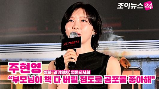 배우 주현영이 지난 24일 오후 서울 용산구 CGV 용산아이파크몰에서 열린 영화 '괴기열차'(감독 탁세웅) 언론시사회에 참석해 소감을 말하고 있다. [영상=정소희, 문수지 기자]