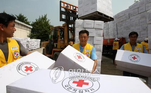 지난 2007년 북한으로 보내는 수재민 지원 물자를 싣는 적십자 봉사자들 |