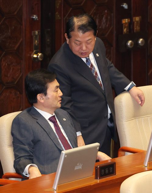더불어민주당 안규백·김병주 의원이 지난 2월 13일 국회 본회의장에서 열린 경제분야 대정부질문에 참석해 대화하고 있다. (사진=연합뉴스) |