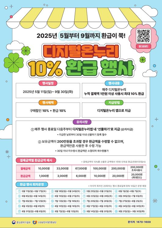 이는 전국 디지털온누리상품권 가맹점 약 12만7000곳에서 디지털온누리상품권으로 결제한 소비자에게 회차별 누적 결제금액의 10%를 디지털온누리상품권으로 환급해주는 방식이다.