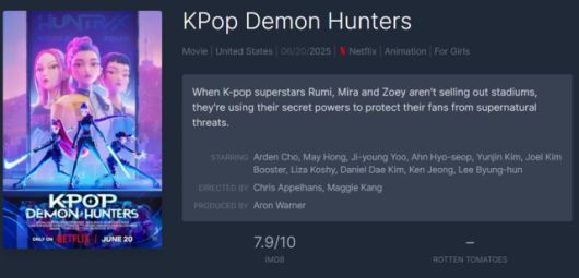케이팝 데몬 헌터스는 소니 픽처스 애니메이션에서 제작한 미국의 넷플릭스 오리지널 애니메이션 영화로, K-팝 걸그룹이자 퇴마사인 주인공들이 저승사자인 보이그룹으로부터 팬들을 지켜낸다는 내용을 담았다.