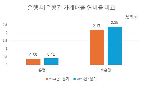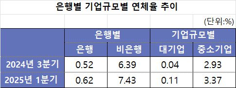 기업의 연체율을 보면 은행의 1분기 연체율은 0.62%로 지난해 3분기(0.52%)와 비교해 0.2%p 상승한 반면 비은행 기관은 7.43%로 같은 기간 1.04%p 올랐다.