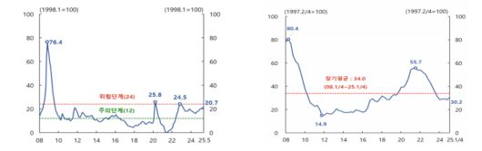 내수 회복이 더뎌지고 미 트럼프 정부의 관세정책으로 수출에 대한 불확실성이 커지면서 우리나라의 금융불안지수(FSI)가 이미 '주의단계'를 넘어선 것으로 나타났다. 부동산 상승 기대감에 가계대출이 주택 매매로 쏠리고, 중소기업·자영업자 등을 중심으로 대출 연체율이 늘어나면 금융시스템 건전성이 위협받는 '위기단계'로 진입할 수 있다는 분석이 나온다.