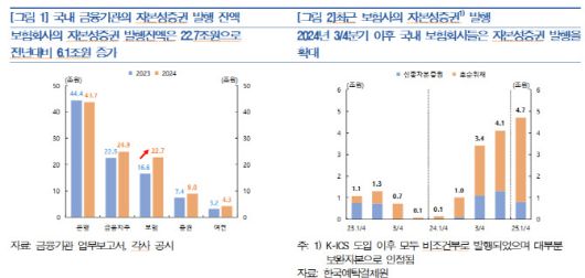 2023년 이후 분기마다 1조원 내외 수준에 불과했던 보험사의 자본성증권 발행액은 2024년 3분기에는 3조 4000억원으로 증가하며 오름세를 이어갔다. 2025년 1분기 중에는 4조 7000억원까지 확대됐다.