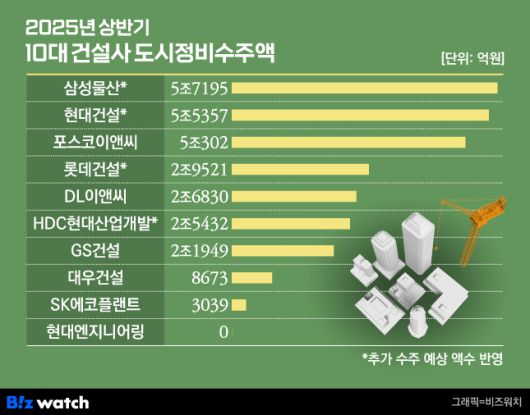 삼성물산은 이날 기준 도시정비사업 수주액이 5조213억원이다. 주요 수주 사업지로는 △한남4구역 재개발(공사비 1조5695억원) △신반포4차 재건축(1조310억원) △장위8구역 공공재개발(1조1945억원) 등이 있다.