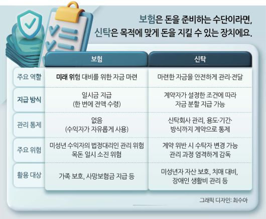 그런데 보험은 말 그대로 ‘재원을 마련하는 장치’일 뿐, 그 돈이 어떻게 쓰일지까지 관리해 주지는 않습니다. 특히 보험금은 한 번에 지급되는 형태인 ‘일시금’으로 지급되기 때문에 계획 없이 빠르게 돈을 다 써버리는 상황이 생길 수도 있죠. 결국, 보험으로 돈을 준비하는 것과 그 돈을 안전하게 전달·관리하는 것은 별도의 문제로 생각해야 합니다.
