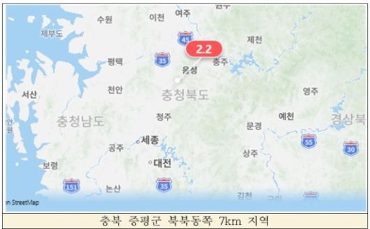 충북도 등에 따르면 이날 오전 5시59분35초 증평군 북북동쪽 7㎞ 지점에서 규모 2.2의 지진이 발생했다.