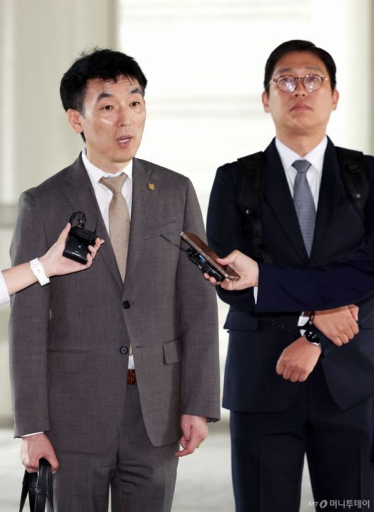 [서울=뉴시스] 이영환 기자 = 김용현 전 국방부 장관의 변호인 이하상 변호사가 25일 오전 서울 서초구 서울중앙지방법원에서 열린 김 전 장관의 구속영장 심문기일에 출석하며 취재진의 질문에 답하고 있다. 이 변호사 오른쪽은 유승수 변호사. 2025.06.25. 20hwan@newsis.com /사진=이영환 |