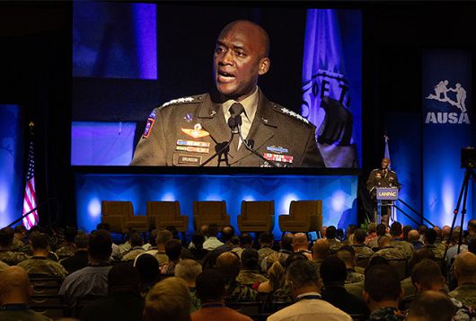 ▲ 제이비어 브런슨 주한미군사령관이 5월 15일(현지시간) 하와이 호놀룰루에서 열린 태평양 지상군 심포지엄에서 기조연설을 하고 있다. 브런슨 사령관은 동북아시아에서 억지력을 유지하고 지역 안보를 확보하는 데 지상군의 역할이 매우 중요하다고 강조했다. ⓒ미 국방부