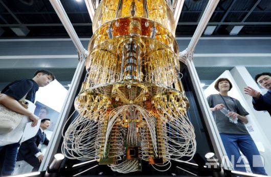 [서울=뉴시스] 김진아 기자 = 24일 서울 서초구 aT센터에서 열린 '퀀텀 코리아 2025'에서 관람객들이 IBM '퀀텀 시스템 원(Quantum System One)' 양자컴퓨터 모형에 대한 설명을 듣고 있다. 2025.06.24. bluesoda@newsis.com |