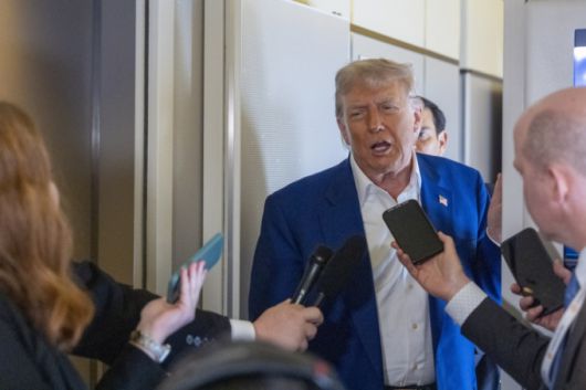 도널드 트럼프 미국 대통령이 24일(현지 시간) 메릴랜드주 프린스 조지 카운티에 있는 조인트 베이스 앤드루스에서 북대서양조약기구(나토) 정상회의 참석 차 네덜란드로 향하는 전용기에 탑승해 취재진 질문에 답하고 있다. /AP=뉴시스 |