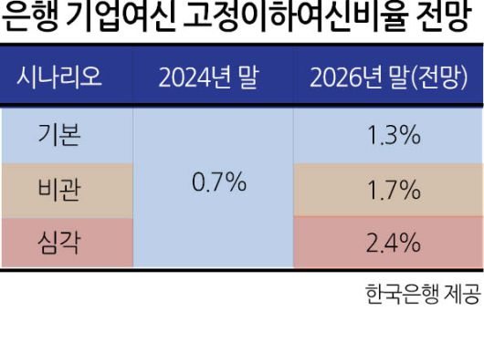 한은이 최근 대내외 불확실성이 현실화하는 충격 시나리오를 가정한 결과 ‘심각’ 시나리오에서 오는 2026년 말까지 고정이하여신비율은 2.4%까지 높아지는 것으로 분석됐다. 심각 시나리오는 내수와 수출이 동반 침체되는 가운데 신용위험이 높아지는 상황을 상정하고 있다.