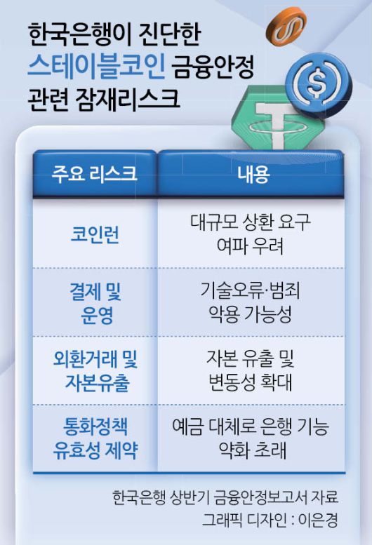 한국은행은 스테이블 코인에 대해 결제 수단으로서의 잠재력을 주목하면서도 금융안정 측면에선 여전히 신중한 접근이 필요하다는 입장을 밝혔다. 특히 디페깅(가치연동이 깨지는 현상)에 따른 ‘코인런’(가상화폐 대규모 인출 요구) 우려, 외환시장 불안, 통화정책 약화 등을 주요 잠재 리스크 요인으로 지목했다.