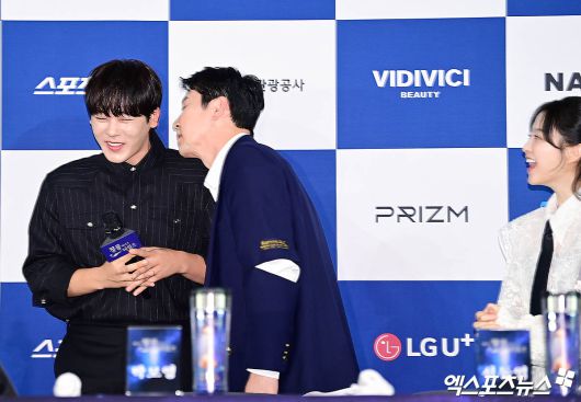 (엑스포츠뉴스 박지영 기자) 25일 오전 서울 여의도 CGV에서 '제4회 청룡 시리즈 어워즈' 핸드프린팅 행사가 진행됐다. 이날 행사에 참석한 신동엽이 이정하에게 장난을 치고 있다. 박지영 기자 jypark@xportsnews.com