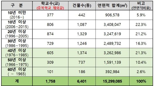서울시교육청에 따르면 40년 이상 경과된 노후 교사동이 현재 전체 학교 면적의 약 34%에 이르며, 10년 이내 그 비율은 50%를 넘어설 것으로 예상된다. 이에 따라 구조안전 저하와 학습 환경 악화에 대한 우려가 커지고 있는 실정이다.