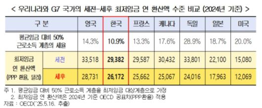 경총은 첫 번째 기준인 유사근로자 임금에 대해 "우리 최저임금은 적정수준의 상한선인 중위임금의 60%를 이미 달성했으며, 이는 최고 수준 선진국인 G7 국가 평균(2024년 기준 50.1%)보다 월등히 높다"고 설명했다.