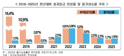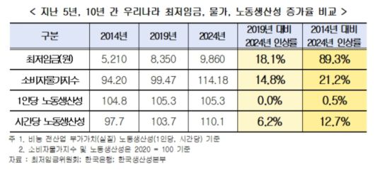 경총에 따르면 최근 5년간 최저임금 누적 인상률은 18.1%로 동 기간 물가상승률(14.8%)보다 높다. 또한 최근 10년간 최저임금 누적 인상률은 89.3%로 동 기간 물가상승률(21.2%)의 4.2배 수준에 달했다.