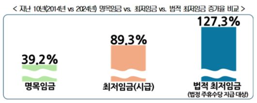 경총은 "지난 10년간 명목임금이 39.2% 오르는 동안, 최저임금은 89.3% 인상됐으며, 특히 주 15시간 이상 근로자(법정 주휴수당 지급 대상)의 법적 최저임금 인상률은 127.3%에 달한다"고 설명했다.