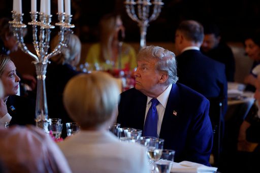 네덜란드 헤이그에서 나토 정상회의가 개막한 24일(현지시간) 빌럼 알렉산더르 네덜란드 국왕 주최로 열린 기념 만찬에 참석한 도널드 트럼프 미국 대통령(가운데)이 무엇인가를 응시하고 있다. 로이터연합뉴스 |