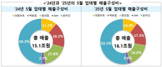 편의점은 -0.2%로 지난달에 이어 역성장세를 보였다. 기업형 슈퍼마켓(SSM)은 0.1%로 소폭 증가했다. 온라인 매출 비중은 전년동월대비 1.3% 포인트(p) 감소한 53.1%를 기록했다.