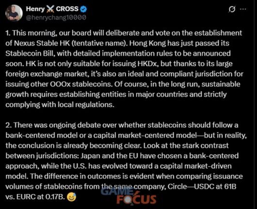 장현국 넥써쓰 대표는 25일 자신의 X(구 트위터)를 통해 홍콩 현지 법인 'Nexus Stable HK' 설립을 발표하며 "홍콩을 시작으로 스테이블코인 사업을 세계로 확장해 나가겠다"는 포부를 전했다.