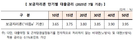 이에 보금자리론 금리는 '아낌e-보금자리론'을 기준으로 연 3.65(10년)~3.95%(50년)로 적용된다.