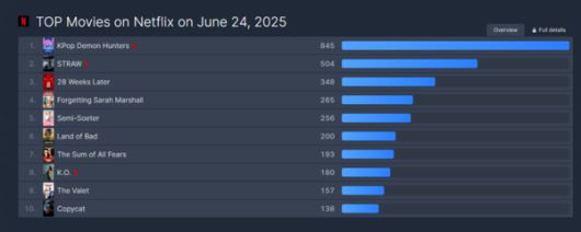또한 24일 기준, 'K-POP DEMON HUNTERS'는 넷플릭스 글로벌 영화 부문 1위에 올랐다. 스트리밍 지표는 845점으로, 2위인 'STRAW'(504점)와 큰 격차를 보이며 압도적인 수치를 기록했다. 이 작품은 같은 날 넷플릭스 상위 10개 영화 중 가장 많은 시청수를 기록하며 단순 음악 프로젝트를 넘어선 콘텐츠 파워를 입증했다.
