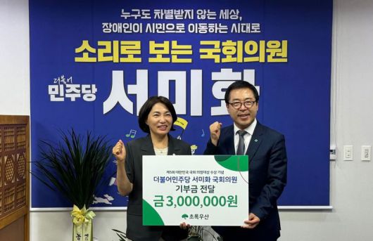 [파이낸셜뉴스] 아동복지전문기관 초록우산은 서미화 더불어민주당 의원이 ‘제5회 대한민국 국회의정대상’ 수상 상금 300만원 전액을 가족돌봄아동을 위해 기부했다고 25일 밝혔다.