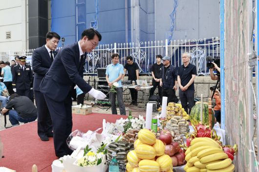 정명근 화성특례시장이 화성 아리셀 공장화재 사고 1주기인 24일, 사고 현장 앞에서 열린 '화성 아리셀 공장화재 사고 1주기 현장 추모 위령제'에 참석해 희생자의 넋을 기리고 유가족을 위로했다.