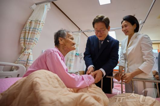 (서울=뉴스1) 이재명 기자 = 이재명 대통령과 부인 김혜경 여사가 25일 전남 고흥군 국립소록도병원을 찾아 한센인들과 인사를 나누고 있다. (대통령실 제공. 재판매 및 DB 금지) 2025.6.25/뉴스12expulsion@news1.krCopyright ⓒ 뉴스1. All rights reserved. 무단 전재 및 재배포, AI학습 이용 금지.