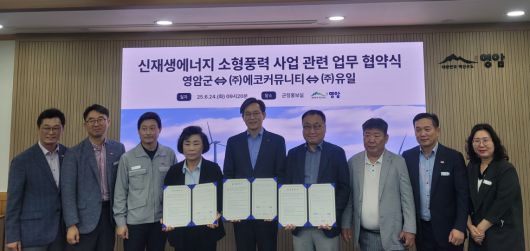 군은 24일 군청에서 민간기업 ㈜에코커뮤니티, ㈜유일과 '소형 풍력발전 공동 추진 업무협약'을 체결했다.