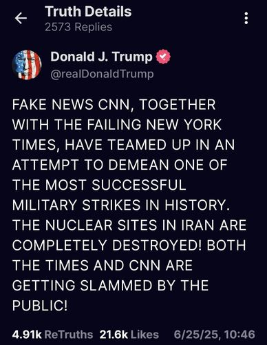 그는 "이란의 핵시설들은 완전히 파괴됐다"면서 "타임스와 CNN은 모두 대중으로부터 비난 받고 있다"고 주장했다.