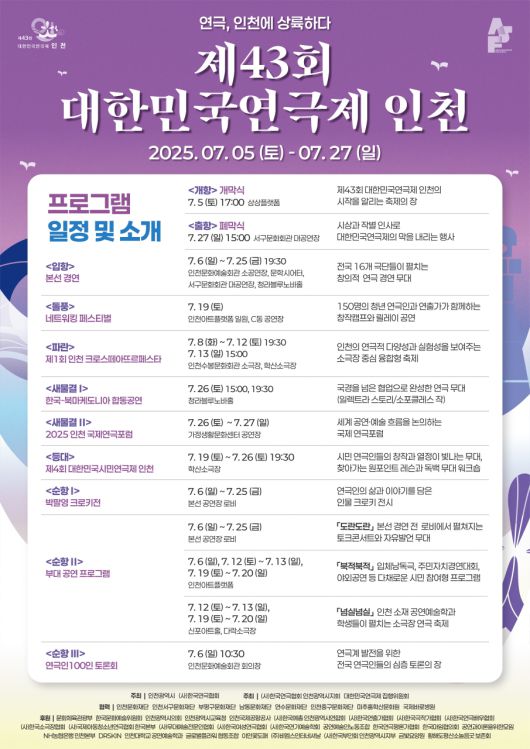 올여름 인천이 연극의 도시로 다시 깨어난다. 인천문화재단이 주최하는 '제43회 대한민국연극제 인천'이 7월 5일부터 27일까지 23일간 인천 전역에서 열린다. 17년 만에 인천에서 열리는 이번 축제는 시민 중심의 무대 실험과 전국 대표작 경연으로 주목받고 있다.