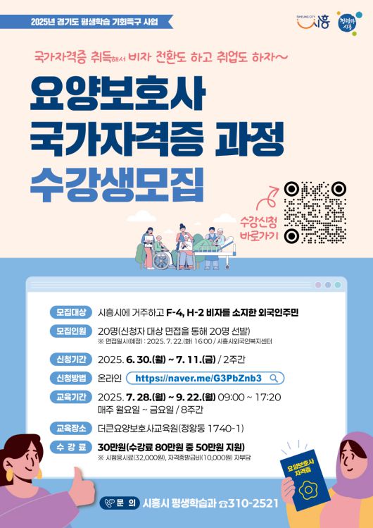 시흥시(시장 임병택)는 2025년 경기도 평생학습 기획특구 사업의 일환으로, 외국인주민의 안정적인 지역 정착과 취업을 지원하기 위한 '요양보호사 국가자격증 과정'을 개설하고, 6월 30일부터 7월 11일까지 수강생 20명을 모집한다.