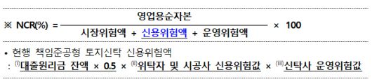 기존에는 부동산신탁사가 토지신탁 사업 운영 시 '관리형' 토지신탁과 '차입형' 토지신탁을 결합한 계약을 유통할 경우 책임준공의무에 대한 NCR(Net Capital Ratio·부동산신탁사의 재무건전성을 평가하는 지표) 위험액 반영은 관리형 토지신탁에 해당하는 부분에만 한정됐다.