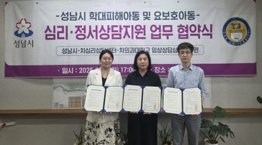 이를 위해 시는 6월 24일 오후 5시 시청 5층 복지국장실에서 김순신 성남시 복지국장과 최태규 차의과대학교 임상상담심리대학원장, 김지연 차심리상담센터장 등이 참석한 가운데 '학대피해아동 및 요보호아동 심리·정서 상담 지원 업무 협력 추진에 관한 협약'을 체결했다.