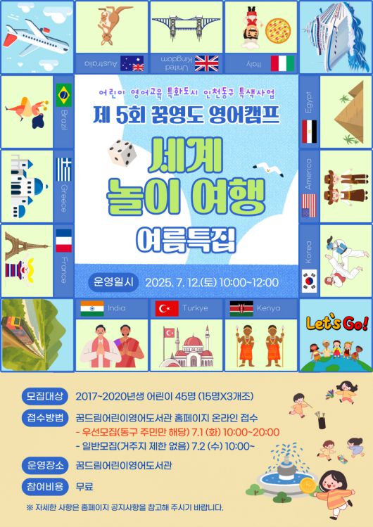 인천 동구(구청장 김찬진)는 오는 7월 1일부터 '제5회 꿈영도 영어캠프' 참가자를 선착순 모집한다. 총 모집 인원은 45명이며, 접수는 꿈드림어린이영어도서관(이하 꿈영도) 홈페이지를 통해 온라인으로 진행된다.