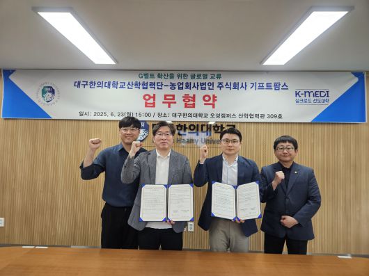 대구한의대학교(총장 변창훈)는 지난 6월 23일(일), 산학협력관 309호 세미나실에서 농업회사법인 주식회사 기프트팜스와 K-MEDI 산업의 글로벌 확산 및 G벨트 해외시장 진출을 위한 업무협약(MOU)을 체결했다고 밝혔다.