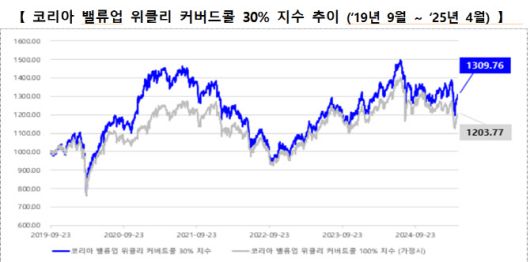 코리아 밸류업 위클리 커버드콜 30% 지수는 코리아 밸류업 지수 매수 손익에 코스피200 위클리 콜옵션 매도를 통해 발생하는 옵션 프리미엄을 재원으로 분배 가능 수익을 확보하는 커버드콜 전략지수다.