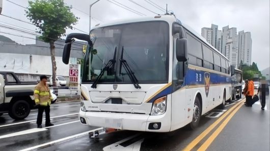 오늘(25일) 낮 12시 44분 대전 동구 대성동의 대별삼거리 부근 도로에서 25t 덤프트럭이 신호 대기하던 경찰 기동대 버스를 들이받는 사고가 났습니다.