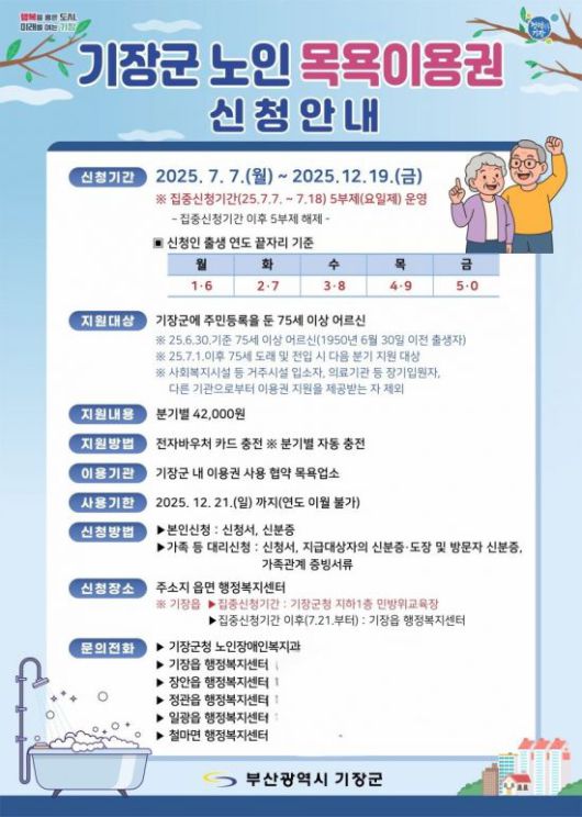 부산 기장군(군수 정종복)이 지역 어르신들의 위생·건강관리를 지원하기 위한 복지 정책으로 '어르신 목욕이용권 지원사업'을 7월부터 본격 시행한다.
