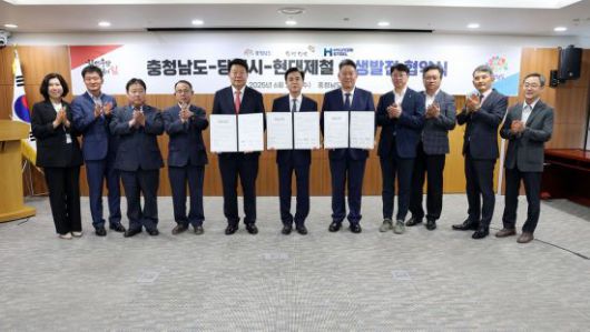 김태흠 충남지사는 25일 도청 상황실에서 오성환 당진시장, 서강현 현대제철 대표이사와 상생 발전 협약을 체결했다.