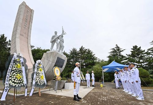 (동해=연합뉴스) 유형재 기자 = 해군 1함대사령부(이하 1함대)는 25일 강원 동해시에 있는 옥계지구전투 전적비에서 '제75주년 옥계지구전투 전승 기념행사'를 거행했다.