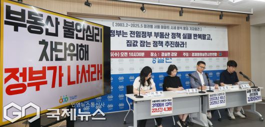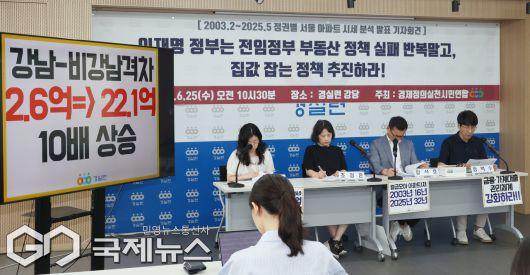 (서울=국제뉴스) 경제정의실천시민연합 구성원들이 25일 오전 서울 종로구 경실련 강당에서 '03년~25년 정권별 서울 아파트 시세 분석 발표 기자회견을 열고 집값 잡는 정책 추진을 촉구하고 있다./사진=이용우 기자